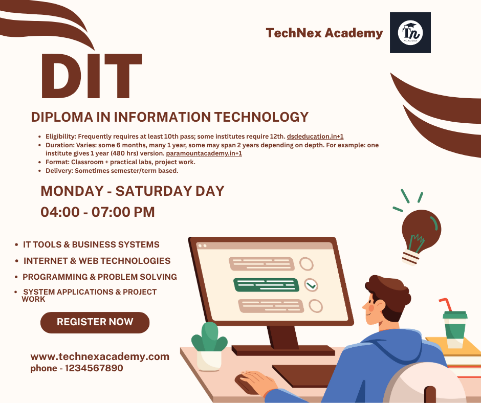 Courses: They list multiple durations (3 months, 6 months, 12 months, 18 months, 24 months) with many “Diploma In …” programmes. technextacademy.com+2technextacademy.com+2